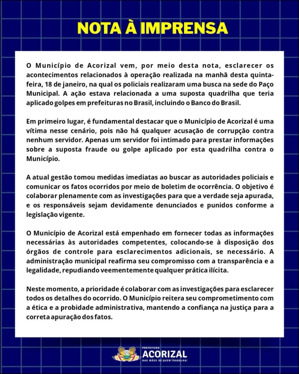 NOTA À IMPRENSA: Prefeitura divulga nota de esclarecimentos a respeito da operação DIGITO 8.